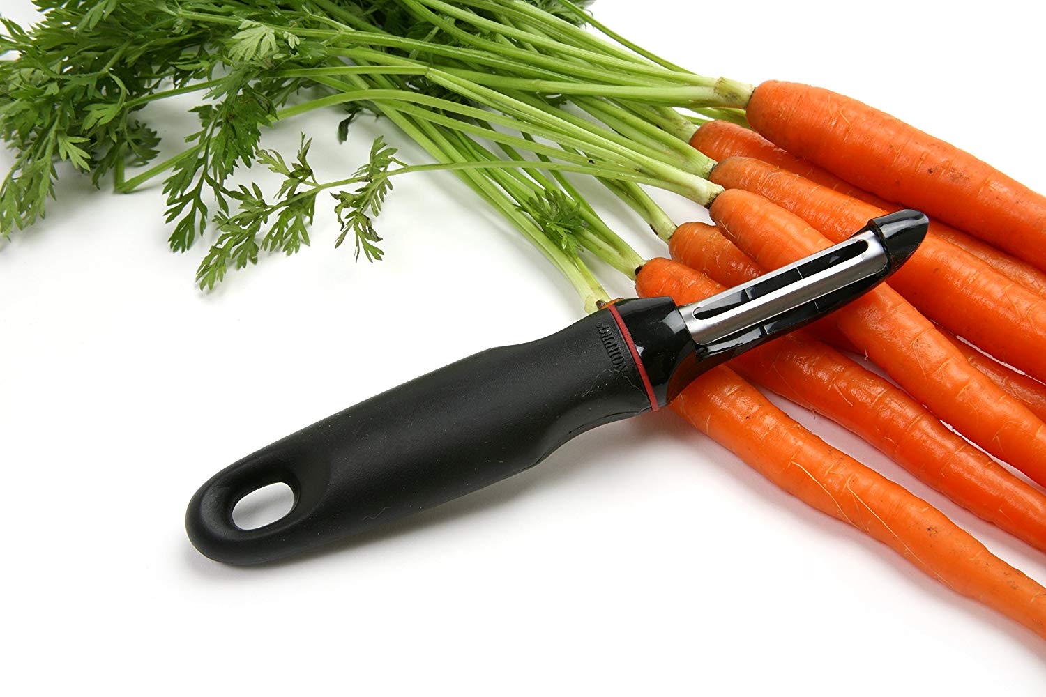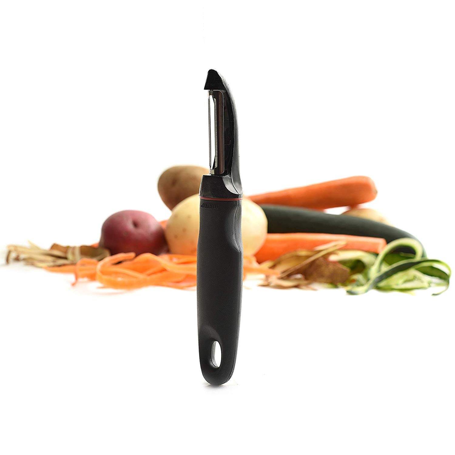 • Stainless steel double edged serrated blade allows back and forth peeling